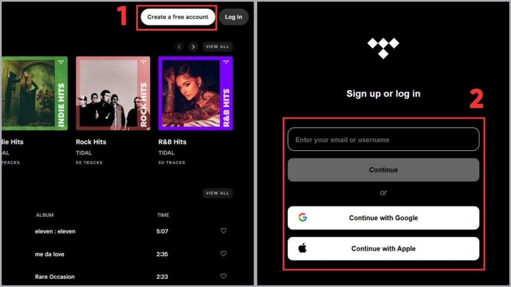- Truy cập tidal.com, chọn “Create a free account” và đăng ký bằng email hoặc tài khoản Google/Apple ID.